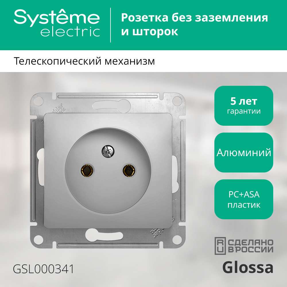 Механизм Systeme Electric (ранее Schneider Electric) серии Glossa (цвет алюминий) розетки одинарной без заземления и без шторок подходит для сетей 250 В, на ток 16 А. - Выполнен из материала PС+ASA, стойкого к УФ-излучению и появлению царапин. - Эргономичные клеммы розеток расположены в один ряд.