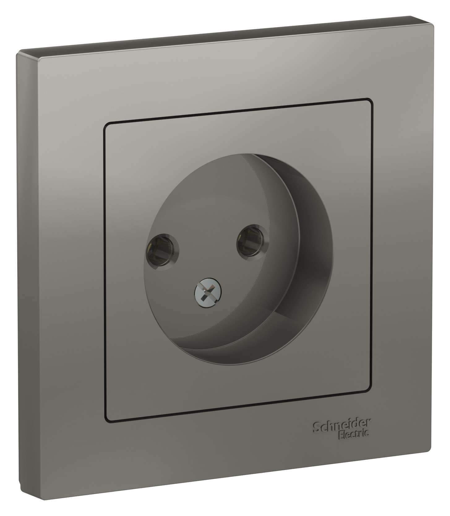 Розетка Systeme Electric (ранее Schneider Electric) серии AtlasDesign (в сборе, цвет сталь) одинарная без заземления и без шторок подходит для сетей 250 В, на ток 16 А. - Лицевые детали из качественного ABS-пластика, устойчивого к царапинам и УФ-излучению. - Изделие поставляется в комплекте с рамкой того же цвета.