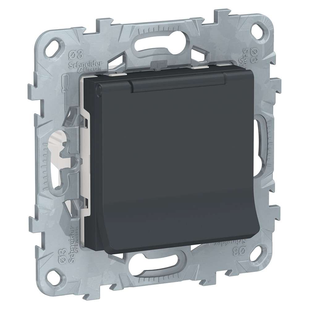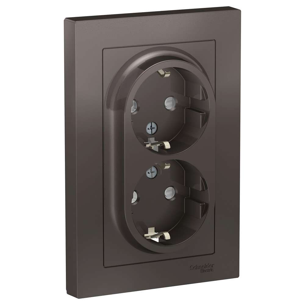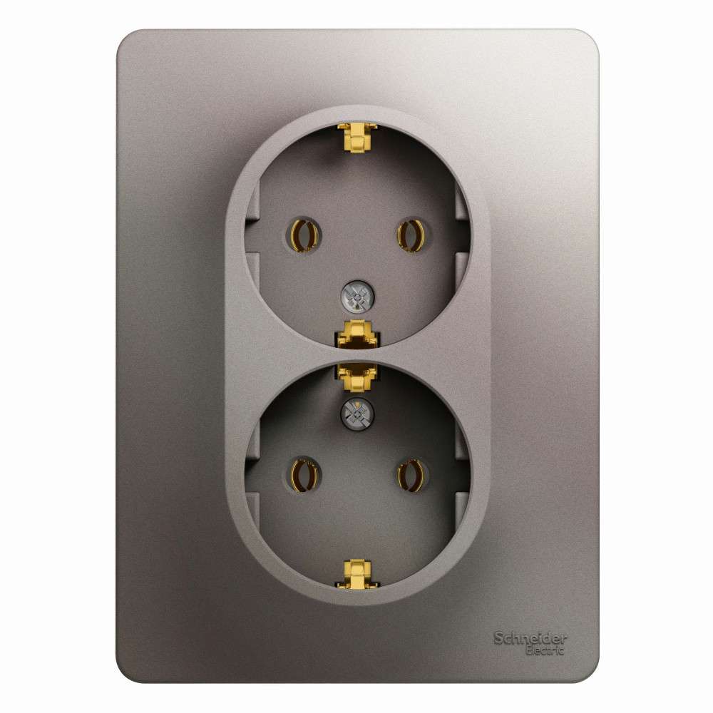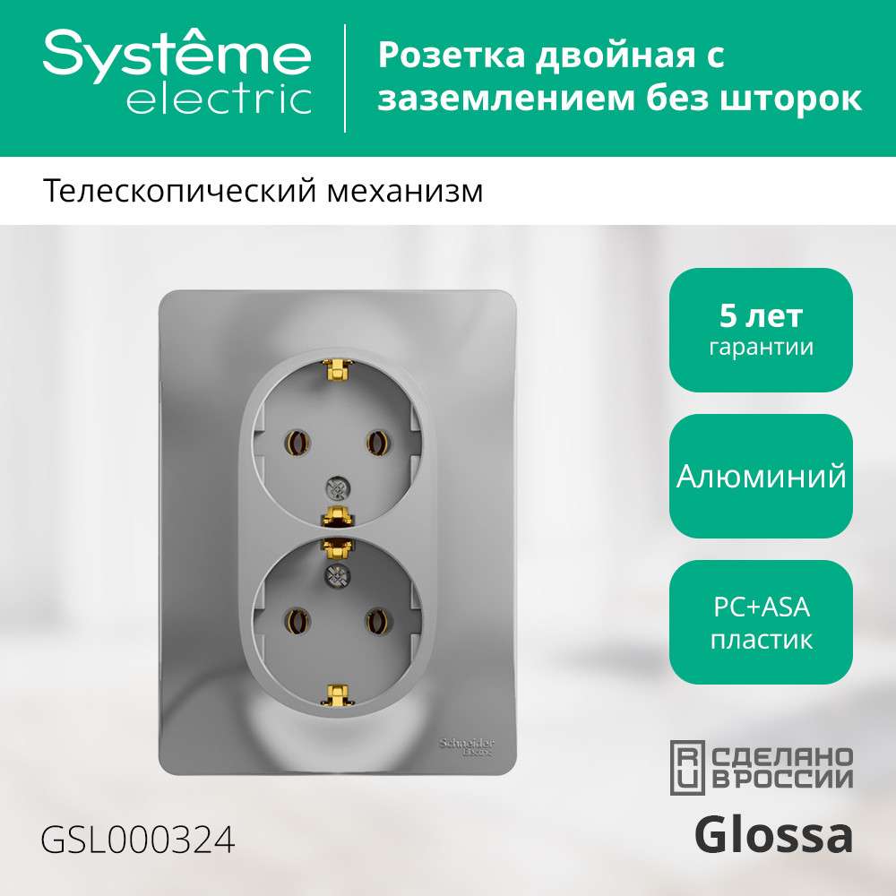 Розетка двойная Systeme Electric (ранее Schneider Electric) серии Glossa (в сборе, цвет алюминий) с заземлением, без шторок подходит для сетей 250 В, на ток 16 А. - Заземляющий контакт обеспечивает дополнительную защиту от удара электрическим током. При наличии заземления электрический потенциал уходит в землю, защищая человека. - Выполнен из материала PС+ASA, стойкого к УФ-излучению и появлению царапин. - Двойная розетка позволяет подключить два устройства в одном месте.