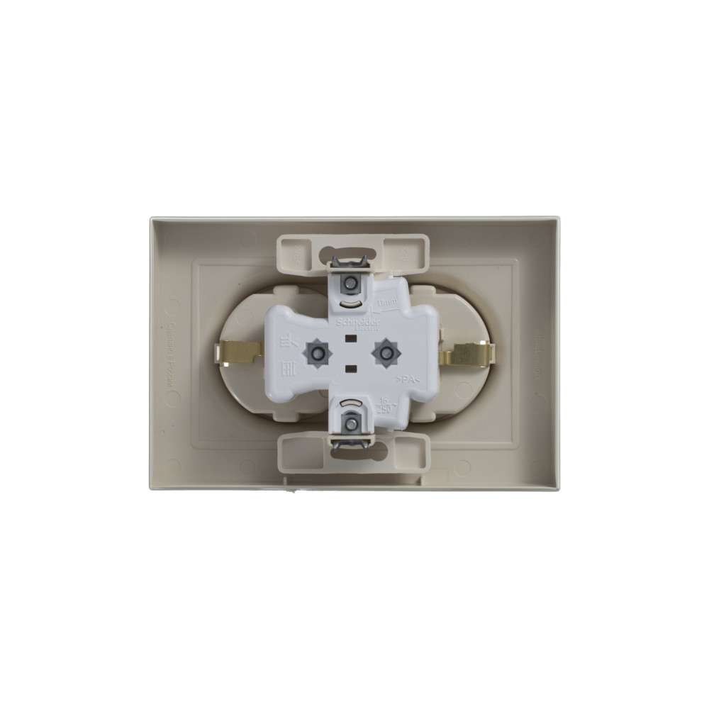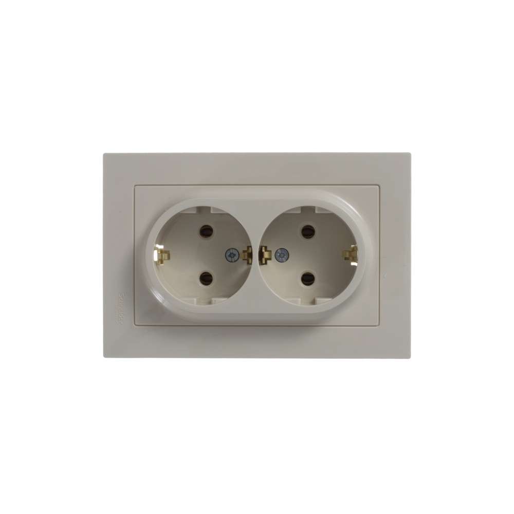 Розетка двойная Systeme Electric (ранее Schneider Electric) серии AtlasDesign (в сборе, цвет бежевый) с заземлением, без шторок подходит для сетей 250 В, на ток 16 А. - Заземляющий контакт обеспечивает дополнительную защиту от удара электрическим током. - Лицевые детали из качественного ABS-пластика, устойчивого к царапинам и УФ-излучению. - Двойная розетка позволяет подключить два устройства в одном месте. - Изделие поставляется в комплекте с рамкой того же цвета.
