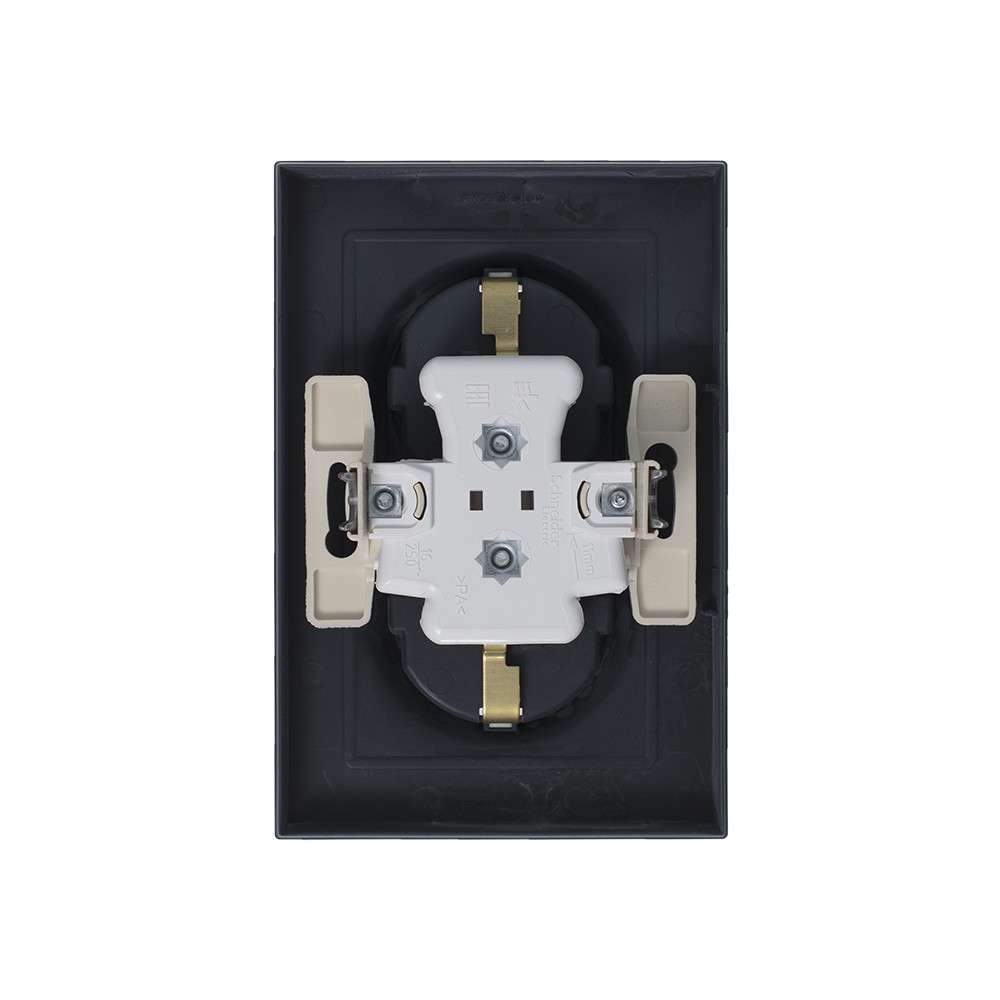 Розетка двойная Systeme Electric (ранее Schneider Electric) серии AtlasDesign (в сборе, цвет грифель) с заземлением, без шторок подходит для сетей 250 В, на ток 16 А. - Заземляющий контакт обеспечивает дополнительную защиту от удара электрическим током. - Лицевые детали из качественного ABS-пластика, устойчивого к царапинам и УФ-излучению. - Двойная розетка позволяет подключить два устройства в одном месте. - Изделие поставляется в комплекте с рамкой того же цвета.