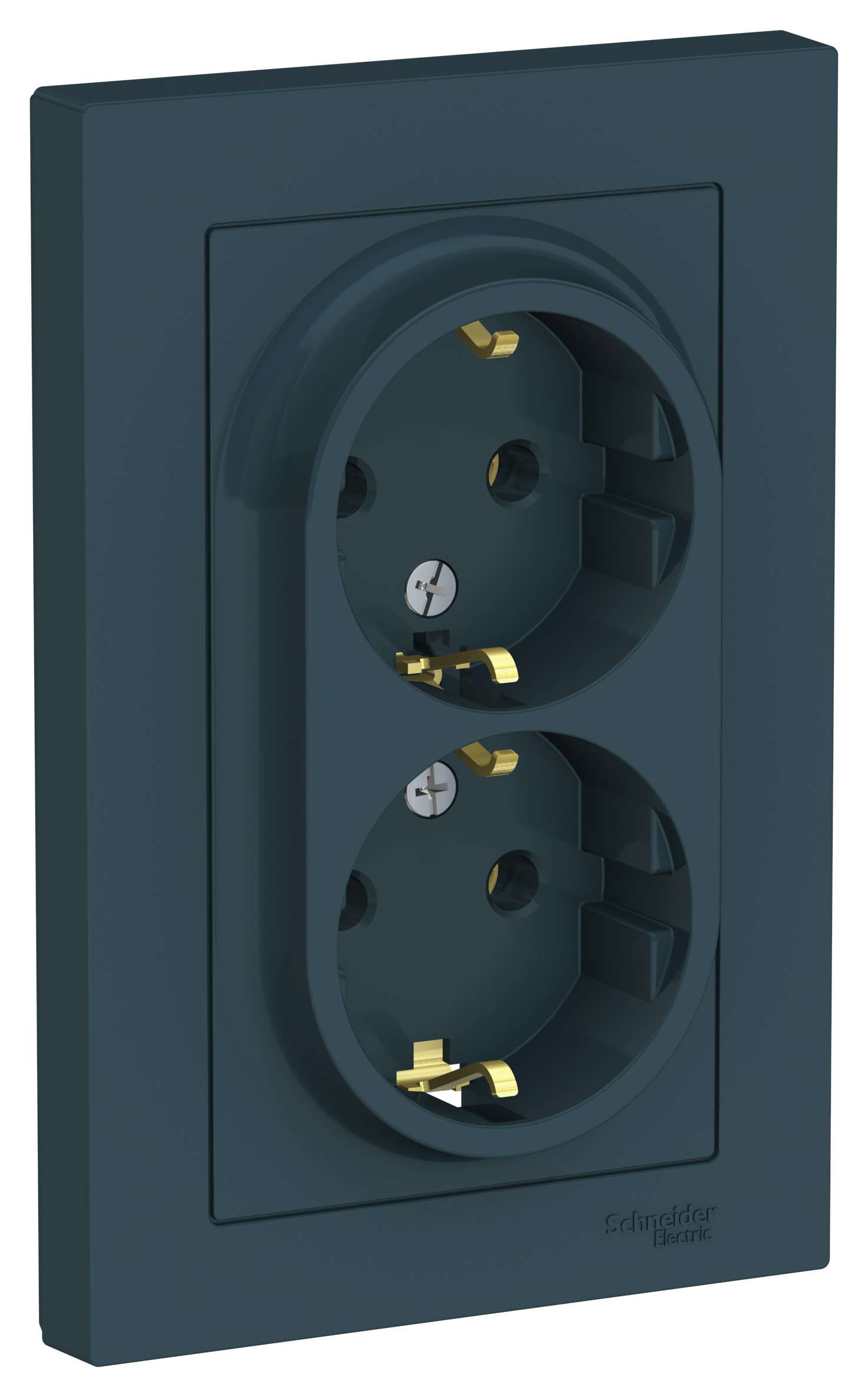 Розетка двойная Systeme Electric (ранее Schneider Electric) серии AtlasDesign (в сборе, цвет изумруд) с заземлением, без шторок подходит для сетей 250 В, на ток 16 А. - Заземляющий контакт обеспечивает дополнительную защиту от удара электрическим током. - Лицевые детали из качественного ABS-пластика, устойчивого к царапинам и УФ-излучению. - Двойная розетка позволяет подключить два устройства в одном месте. - Изделие поставляется в комплекте с рамкой того же цвета.