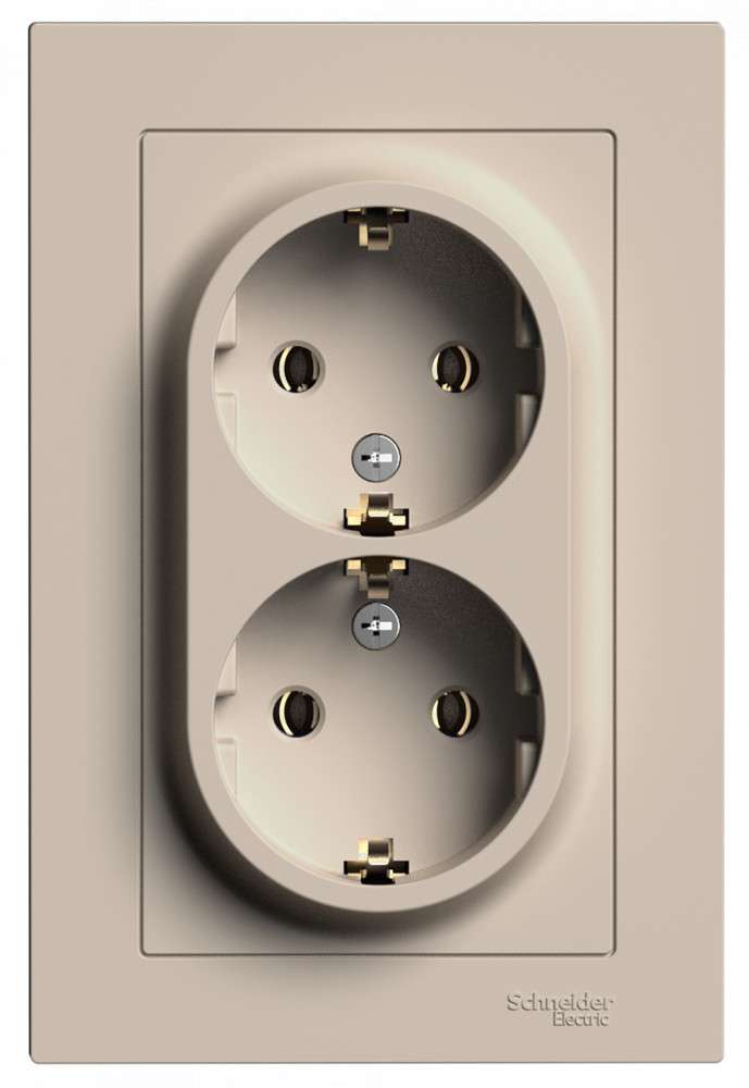 Розетка двойная Systeme Electric (ранее Schneider Electric) серии AtlasDesign (в сборе, цвет ПЕСОЧНЫЙ) с заземлением, без шторок подходит для сетей 250 В, на ток 16 А. - Заземляющий контакт обеспечивает дополнительную защиту от удара электрическим током. - Лицевые детали из качественного ABS-пластика, устойчивого к царапинам и УФ-излучению. - Двойная розетка позволяет подключить два устройства в одном месте. - Изделие поставляется в комплекте с рамкой того же цвета.