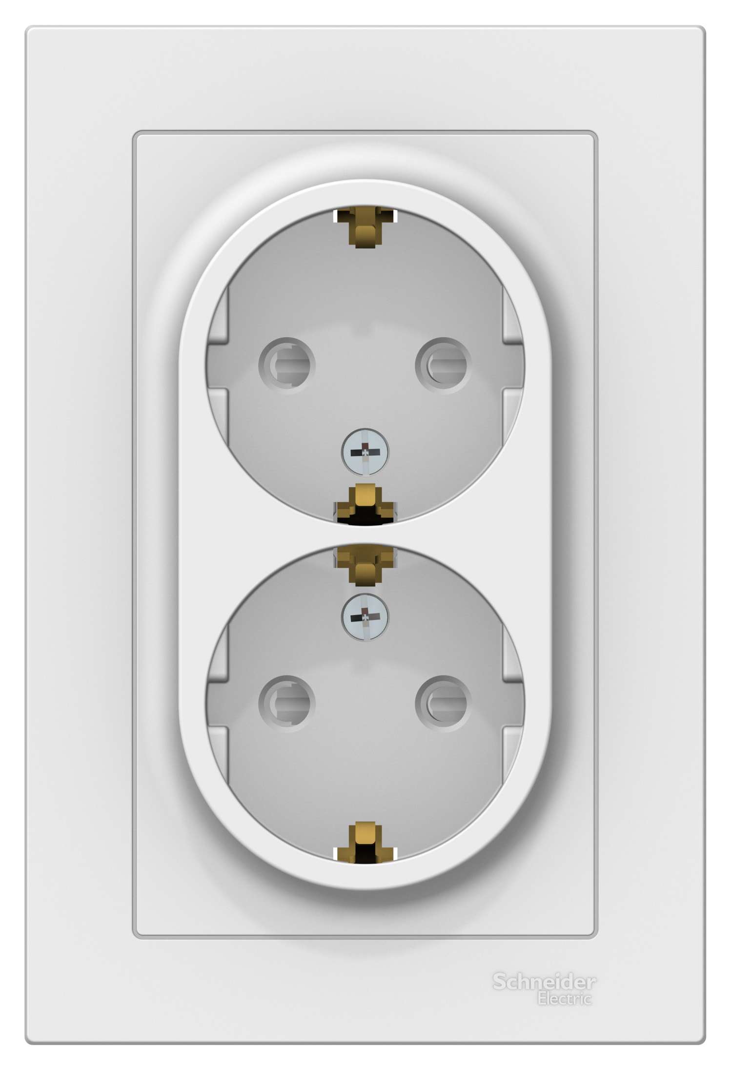 Розетка двойная Systeme Electric (ранее Schneider Electric) серии AtlasDesign (в сборе, цвет белый) с заземлением и шторками подходит для сетей 250 В, на ток 16 А. - Пластик с ионами серебра обеспечивает антибактериальный эффект. - Заземляющий контакт обеспечивает дополнительную защиту от удара электрическим током. - Лицевые детали из качественного ABS-пластика, устойчивого к царапинам и УФ-излучению. - Двойная розетка позволяет подключить два устройства в одном месте. - Изделие поставляется в комплекте с рамкой того же цвета.