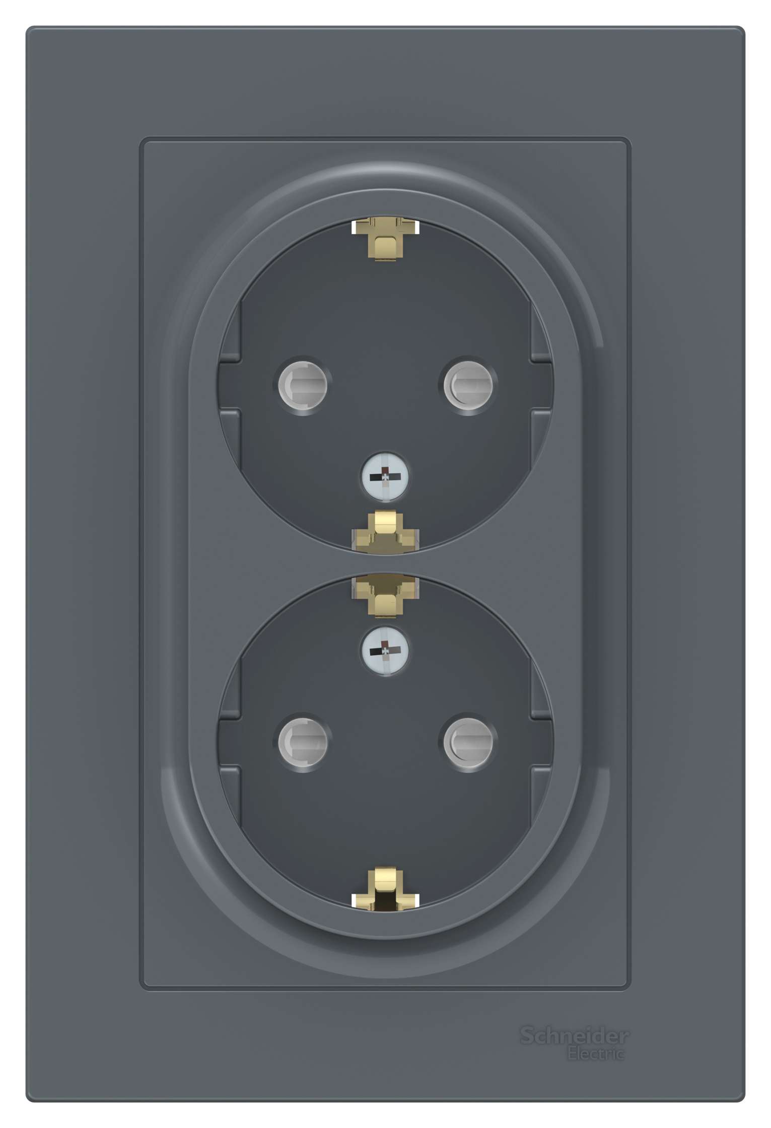 Розетка двойная Systeme Electric (ранее Schneider Electric) серии AtlasDesign (в сборе, цвет грифель) с заземлением и шторками подходит для сетей 250 В, на ток 16 А. - Заземляющий контакт обеспечивает дополнительную защиту от удара электрическим током. - Лицевые детали из качественного ABS-пластика, устойчивого к царапинам и УФ-излучению. - Двойная розетка позволяет подключить два устройства в одном месте. - Изделие поставляется в комплекте с рамкой того же цвета.