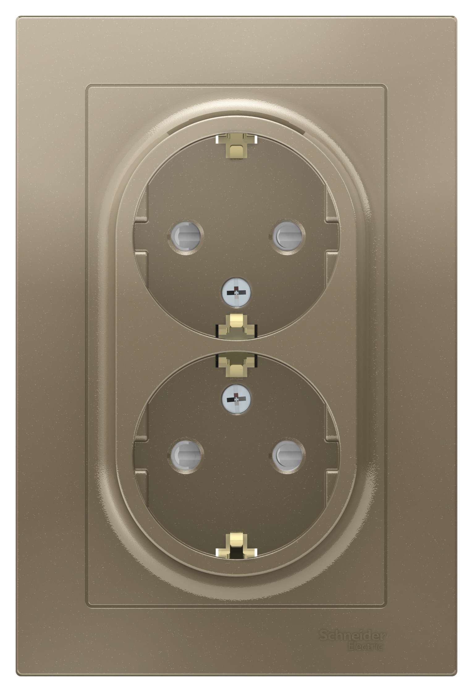 Розетка двойная Systeme Electric (ранее Schneider Electric) серии AtlasDesign (в сборе, цвет шампань) с заземлением и шторками подходит для сетей 250 В, на ток 16 А. - Заземляющий контакт обеспечивает дополнительную защиту от удара электрическим током. - Лицевые детали из качественного ABS-пластика, устойчивого к царапинам и УФ-излучению. - Двойная розетка позволяет подключить два устройства в одном месте. - Изделие поставляется в комплекте с рамкой того же цвета.