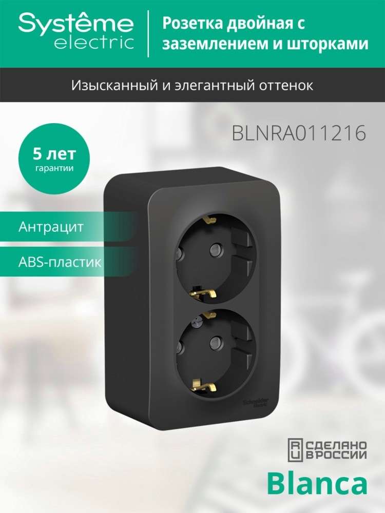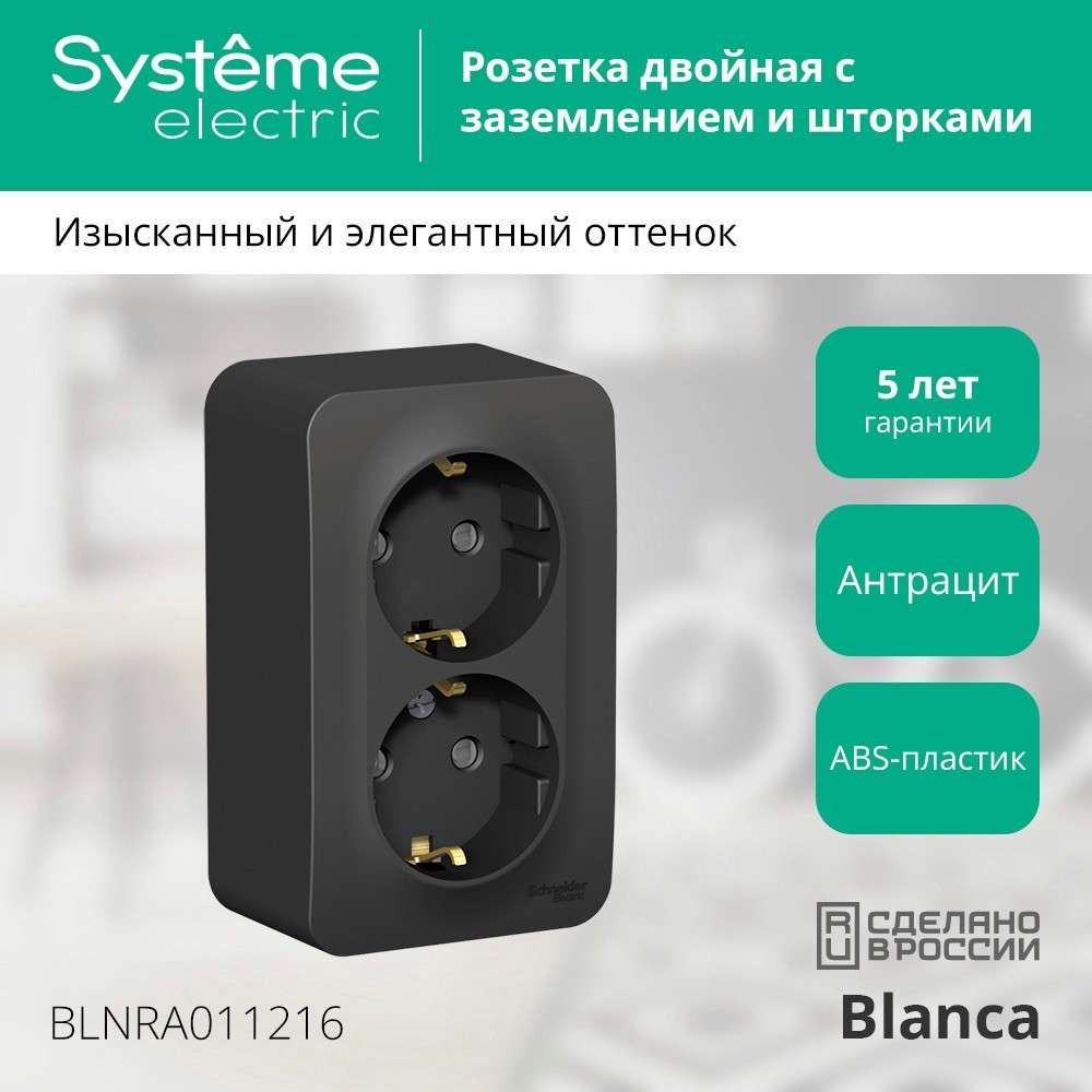 Розетка Systeme Electric (ранее Schneider Electric) BLANCA (антрацит, открытой установки) двухместная, с заземлением, шторками и изолирующей пластиной предназначена для сетей до 250В, на ток до 16А. Двухместная розетка позволяет подключить два устройства в одном месте. Шторки и заземление обеспечивают дополнительную безопасность при косвенном прикосновении.