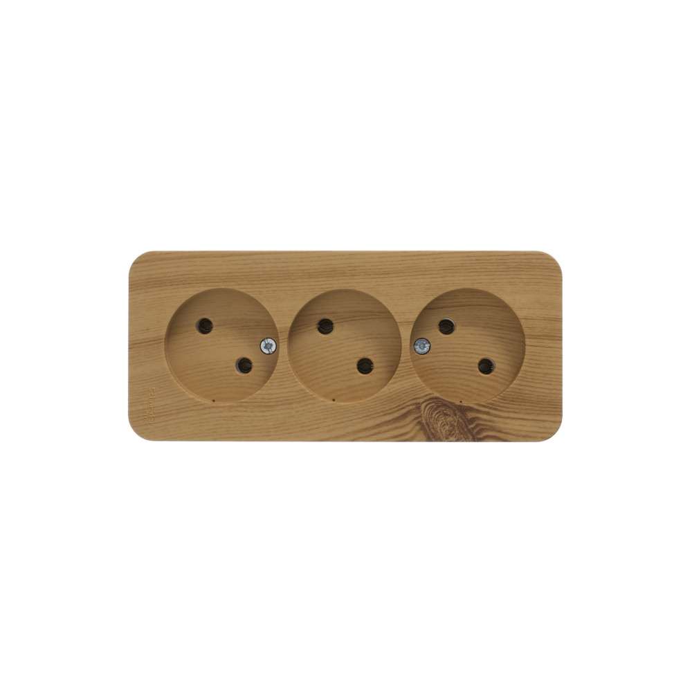 Розетка Systeme Electric (ранее Schneider Electric) BLANCA (ясень, открытой установки) трехместная, без шторок и заземления, с изолирующей пластиной предназначена для сетей до 250В, на ток до 16А. Трехместная розетка позволяет подключить три устройства в одном месте. Изделия цвета Ясень обладают уникальным рисунком, напоминающим древесный сруб. Она изготовлена из ABS-пластика, проста в установке и удобна в применении.