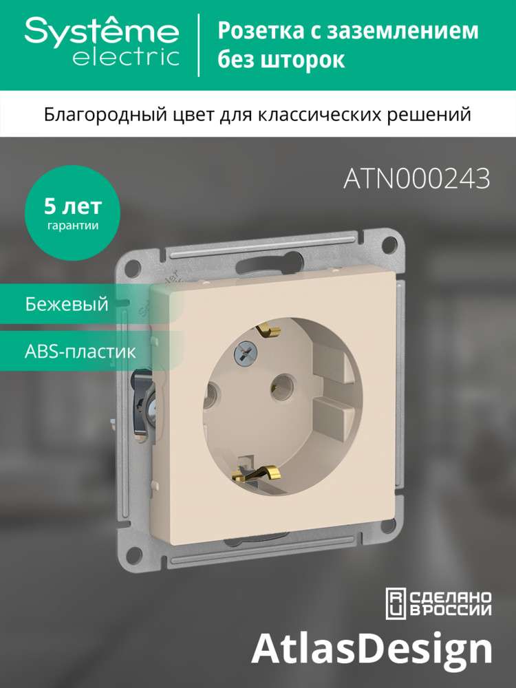 Механизм Systeme Electric (ранее Schneider Electric) серии AtlasDesign в бежевом цвете розетки одинарной с заземлением и без шторок подходит для сетей 250 В, на ток 16 А. - Заземляющий контакт обеспечивает дополнительную защиту от удара электрическим током. При наличии заземления электрический потенциал уходит в землю, защищая человека. - Лицевые детали из качественного ABS-пластика, устойчивого к царапинам и УФ-излучению. - Усиленные прямые монтажные лапки для лучшей фиксации механизма в монтажной коробке.