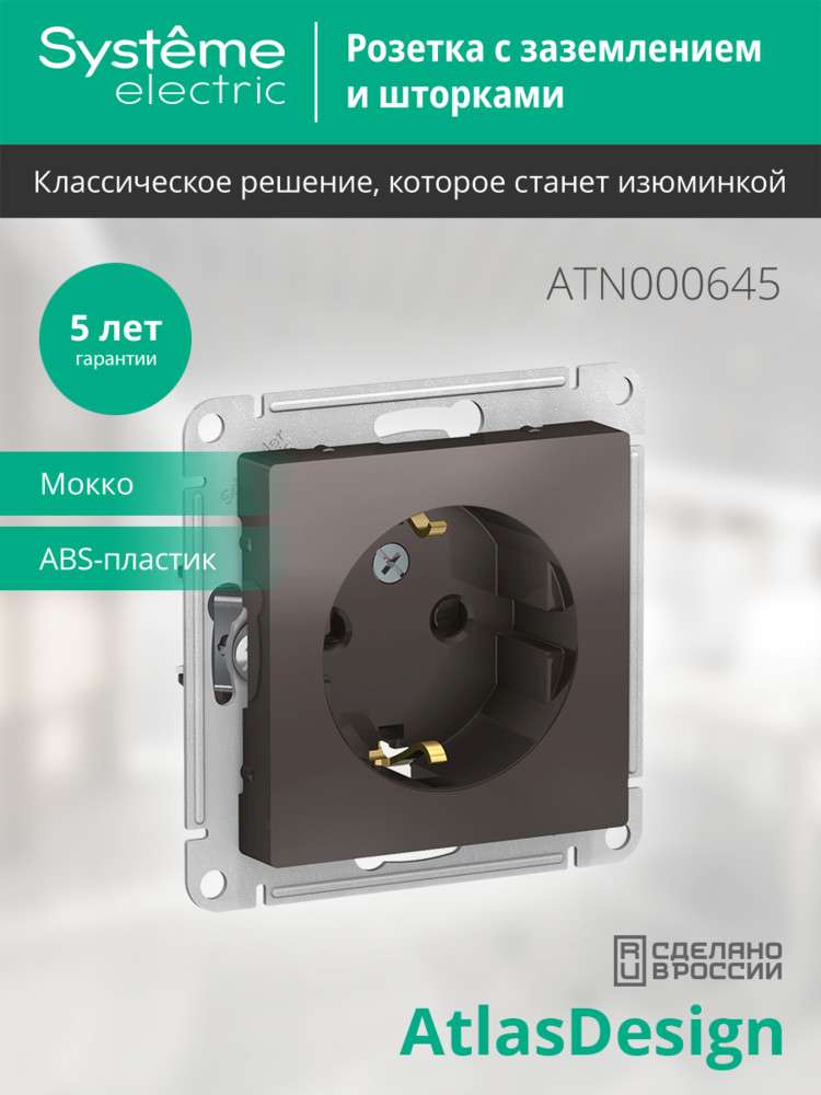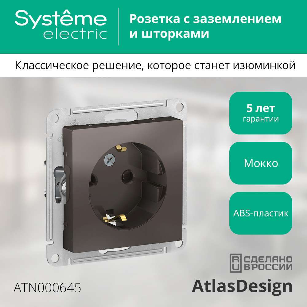 Механизм Systeme Electric (ранее Schneider Electric) серии AtlasDesign в цвете мокко розетки одинарной с заземлением и шторками подходит для сетей 250 В, на ток 16 А. - Заземляющий контакт обеспечивает дополнительную защиту от удара электрическим током. При наличии заземления электрический потенциал уходит в землю, защищая человека. - Лицевые детали из качественного ABS-пластика, устойчивого к царапинам и УФ-излучению. - Усиленные прямые монтажные лапки для лучшей фиксации механизма в монтажной коробке.