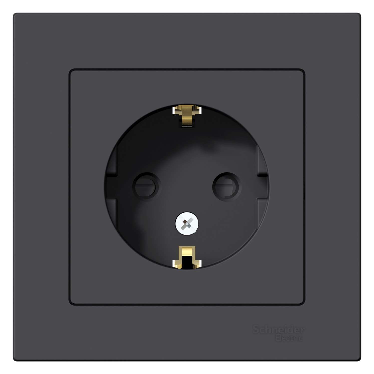 Розетка Systeme Electric (ранее Schneider Electric) серии AtlasDesign (в сборе, цвет карбон) одинарная с заземлением и без шторок подходит для сетей 250 В, на ток 16 А. - Заземляющий контакт обеспечивает дополнительную защиту от удара электрическим током. - Лицевые детали из качественного ABS-пластика, устойчивого к царапинам и УФ-излучению. - Изделие поставляется в комплекте с рамкой того же цвета. - Благодаря покрытию «soft touch» к изделию приятно прикасаться.
