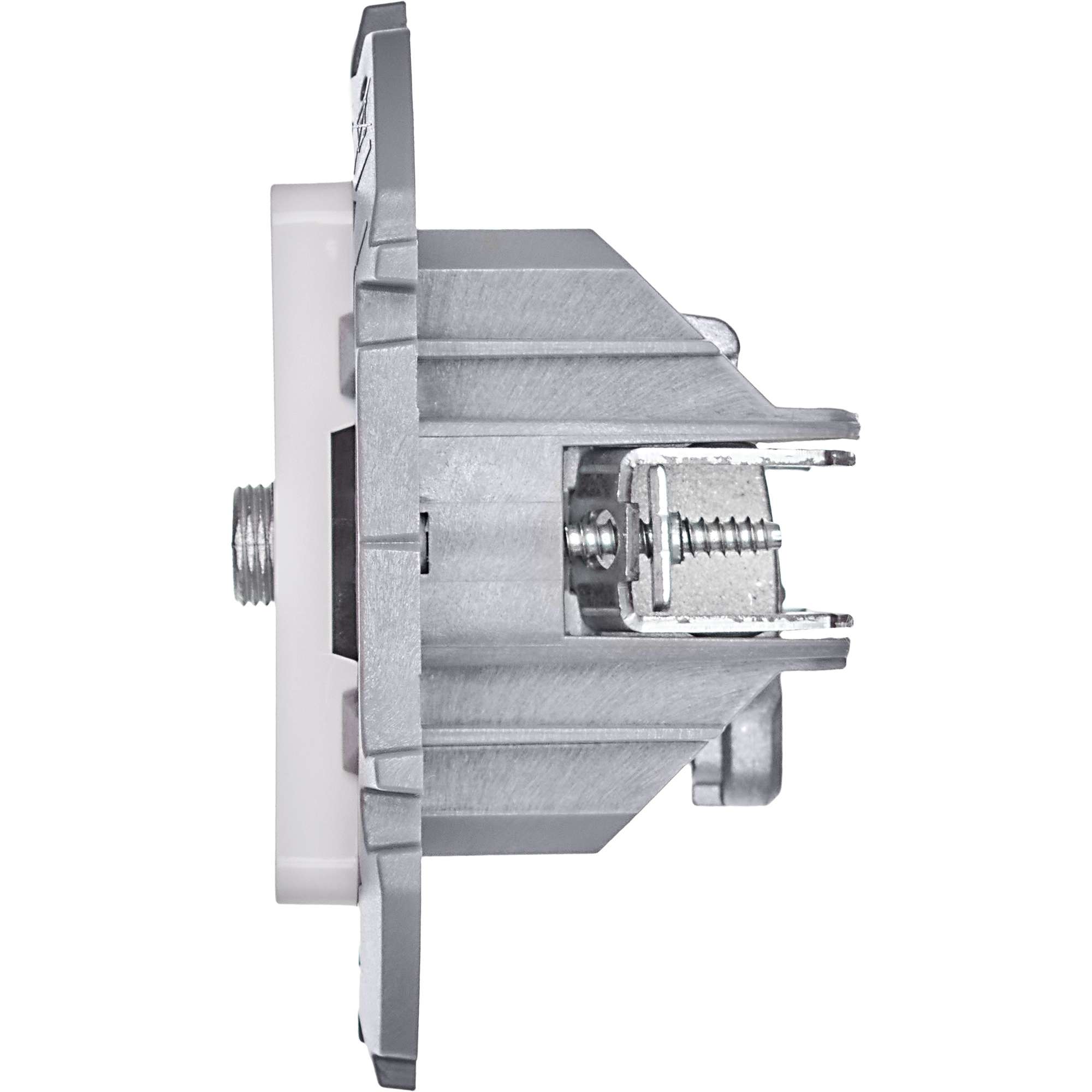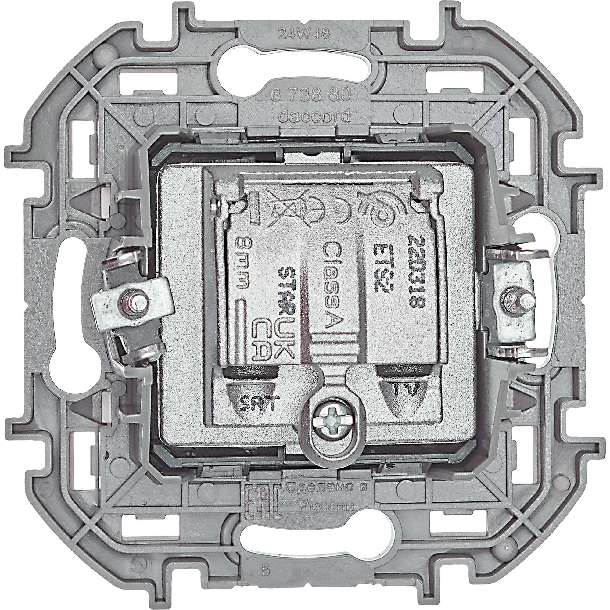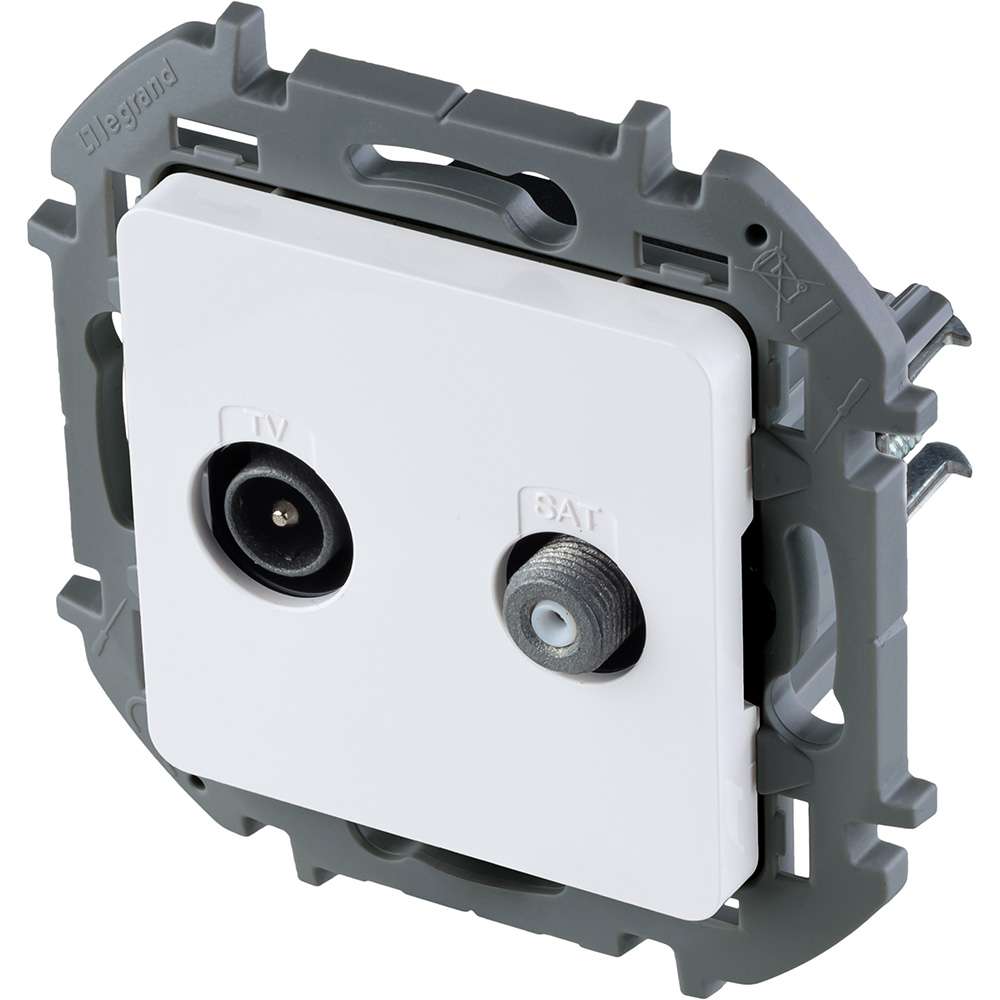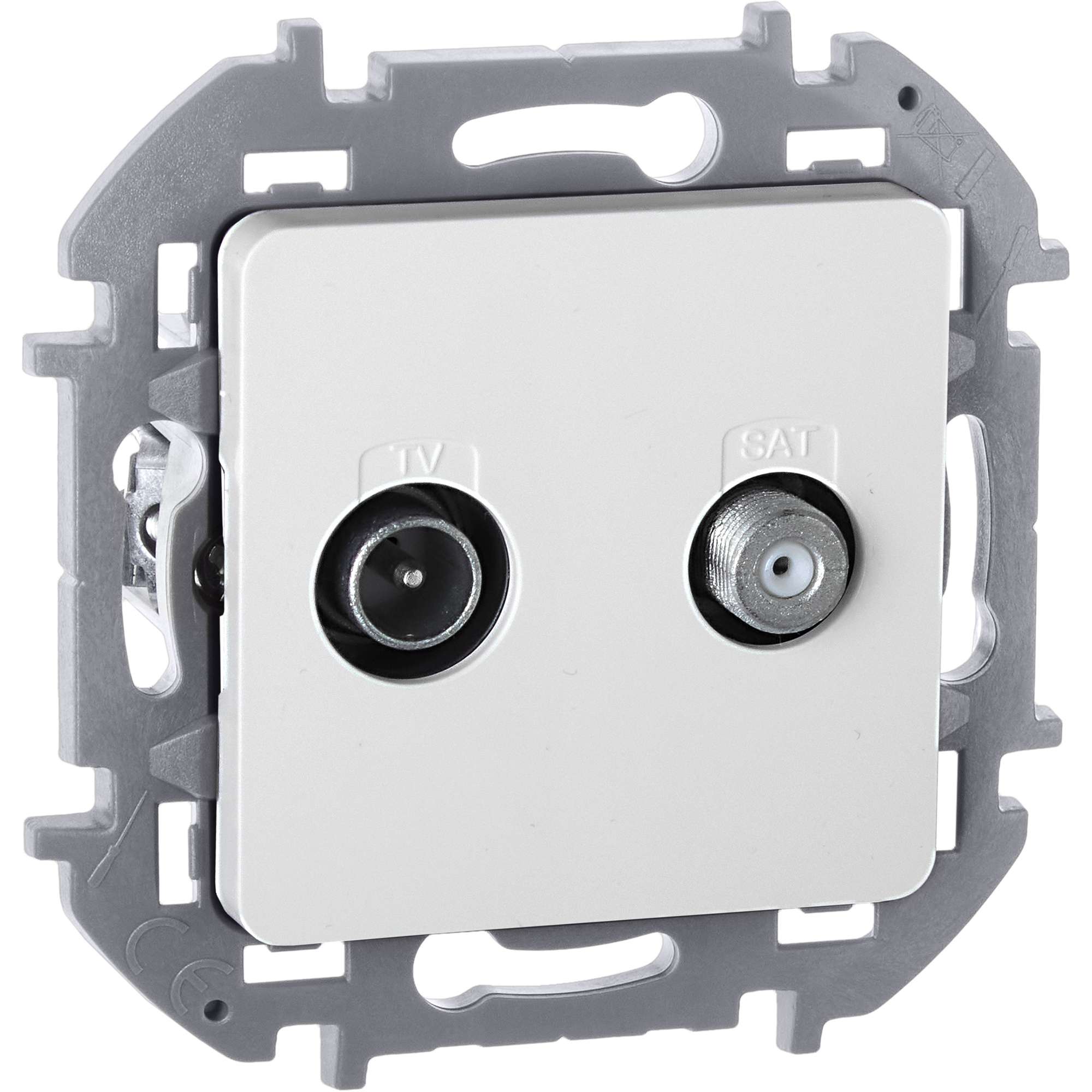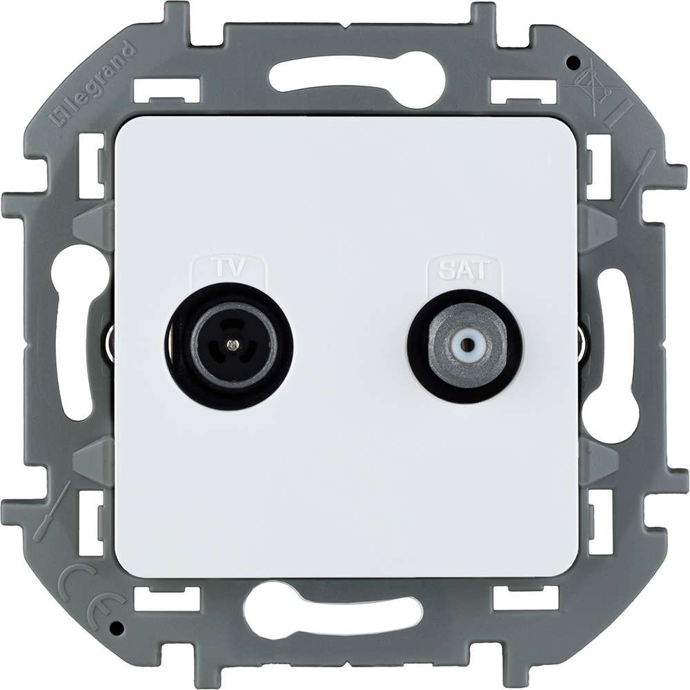 Розетка телевизионная-спутниковая Legrand Inspiria для скрытого монтажа, для схемы звезда, 1.5 дБ 4-2400 МГц / 2 дБ 4-2400 МГц, поддержка обратного питания для активных антенн до 500мА, цвет Белый Используется для подключения одного ТВ приемника к системам эфирного и спутникового вещания, а также для организации телевизионной-спутниковой сети по схеме звезда, когда к каждому телевизору прокладывается своя линия от источников эфирного и спутникового сигналов. Особенности изделия: - Расширенный частотный диапазон 4-2400 МГц обеспечивает уверенную передачу сигнала в сетях различной конфигурации. - Поддержка обратного питания POWER PASS до 500мА позволяют запитывать активные антенны без дополнительной проводки. - Корпус механизма изготовлен из металлического сплава, обладает степенью экранирования Class A и защищает сигнал от электромагнитных помех. - Присоединение коаксиального кабеля к розетке осуществляется удобным безвинтовым коннектором. - 1 вход для подключения 1 кабеля после сумматора сигналов эфирного и спутникового телевидения. - 2 выхода с разделением эфирного и спутникового сигналов. - Лицевая панель изготовлена из качественного пластика ABS, устойчивого к загрязнению и воздействию УФ-излучения.