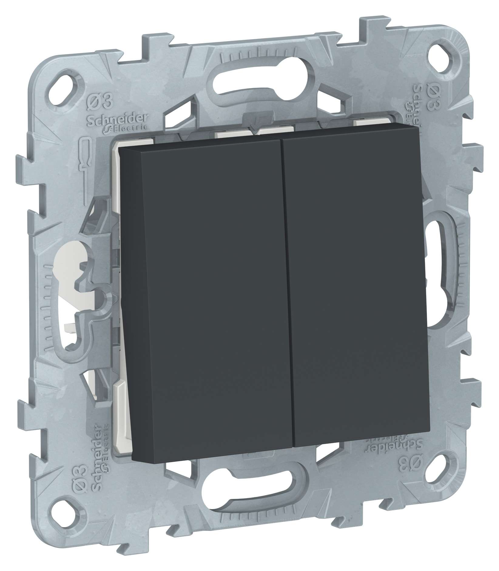 Переключатель двухклавишный Schneider Electric UNICA NEW (антрацит) перекрёстный без подсветки предназначен для сетей до 250 В на ток до 10 А. - 2 переключающих контакта. - Специальные направляющие для облегчения ввода кабеля. - Переключатель позволяет управлять одним источником света из двух точек.