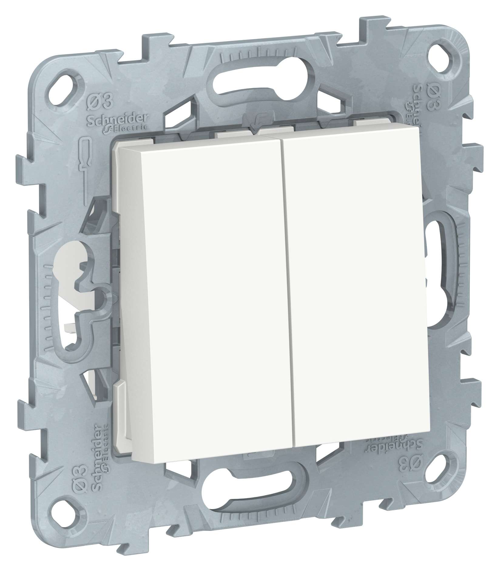 Переключатель двухклавишный Schneider Electric UNICA NEW (белый) перекрёстный без подсветки предназначен для сетей до 250 В на ток до 10 А. - 2 переключающих контакта. - Специальные направляющие для облегчения ввода кабеля. - Переключатель позволяет управлять одним источником света из двух точек.