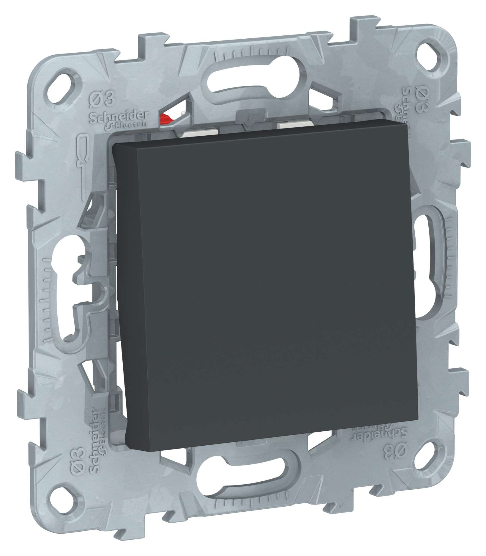 Переключатель одноклавишный Schneider Electric UNICA NEW (антрацит) перекрёстный без подсветки предназначен для сетей до 250 В на ток до 10 А. - 1 переключающий контакт. - Специальные направляющие для облегчения ввода кабеля. - Переключатель позволяет управлять одним источником света из двух точек.