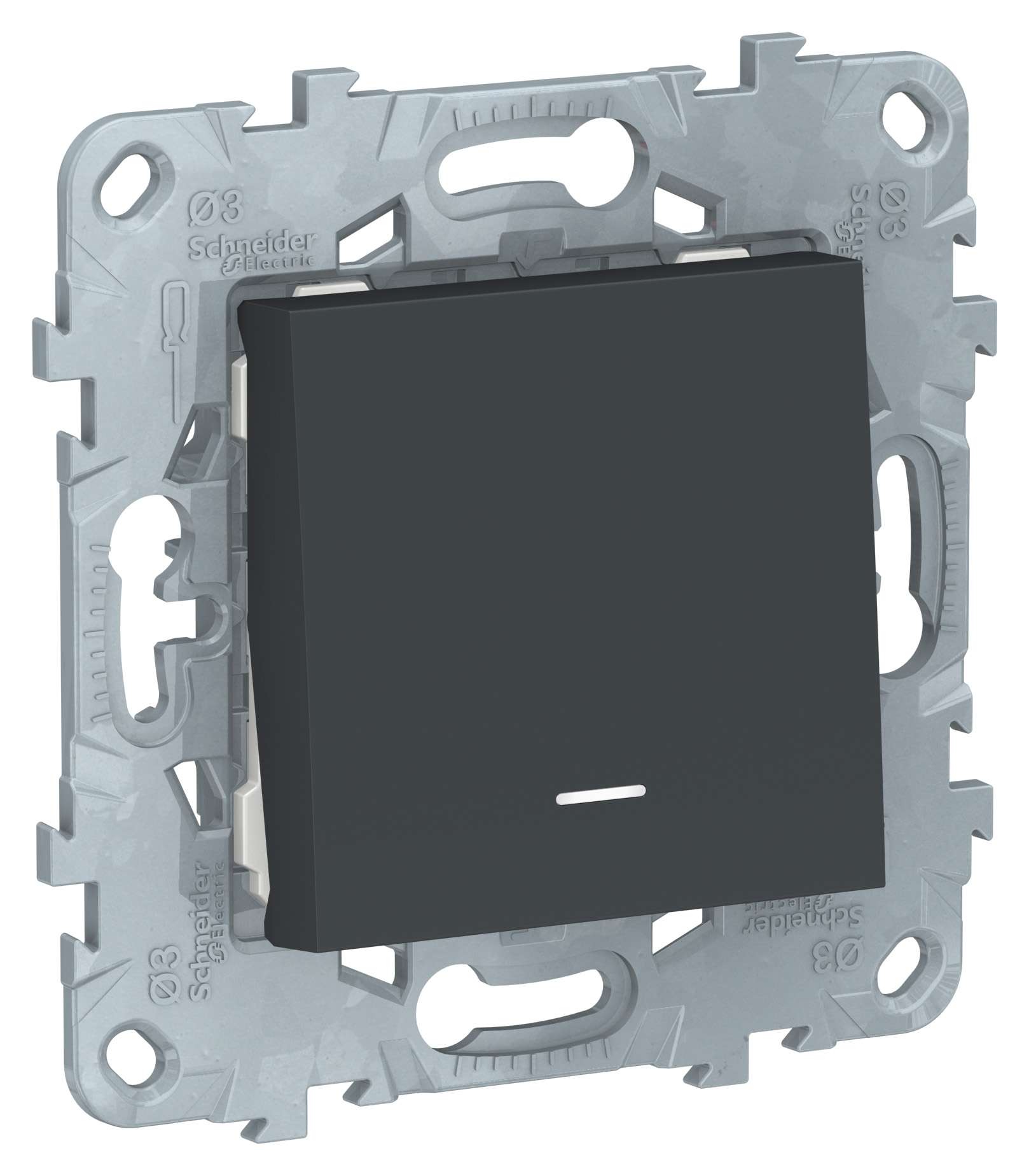 Переключатель одноклавишный Schneider Electric UNICA NEW (антрацит) с подсветкой предназначен для сетей до 250 В на ток до 10 А. - 1 переключающий контакт. - Подсветка делает переключатель легко находимым в отсутствие освещения. - Переключатель позволяет управлять одним источником света из двух точек.