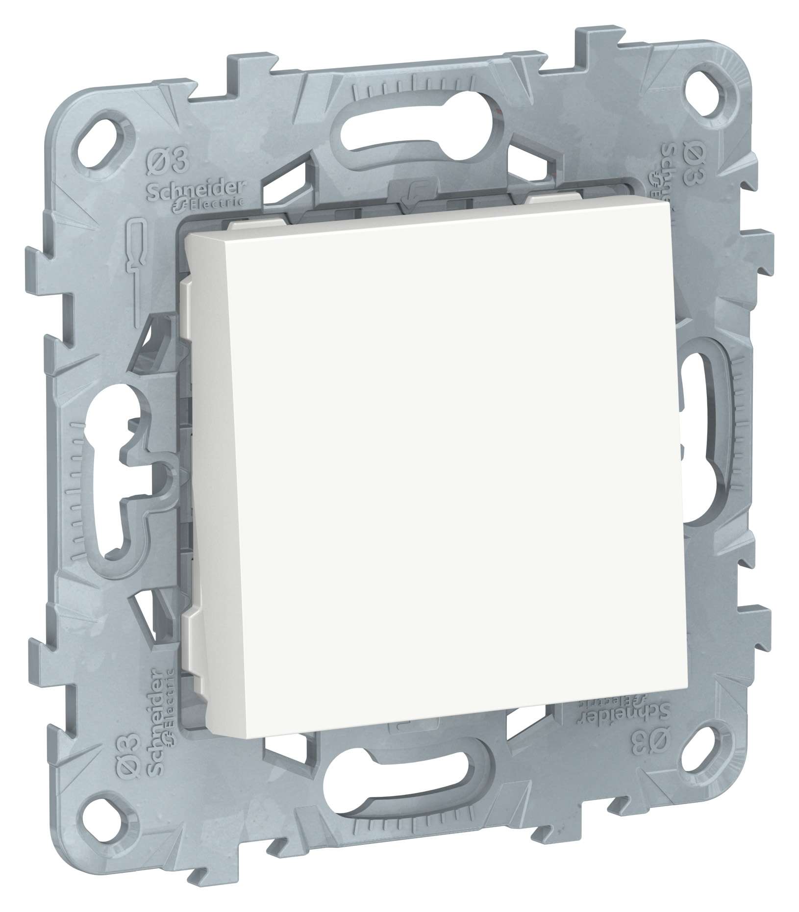 Выключатель одноклавишный Schneider Electric UNICA NEW (белый) без подсветки предназначен для сетей до 250 В на ток до 10 А. - 1 нормально открытый контакт. - Специальные направляющие для облегчения ввода кабеля. - Увеличенные разделители для исключения возможности короткого замыкания.