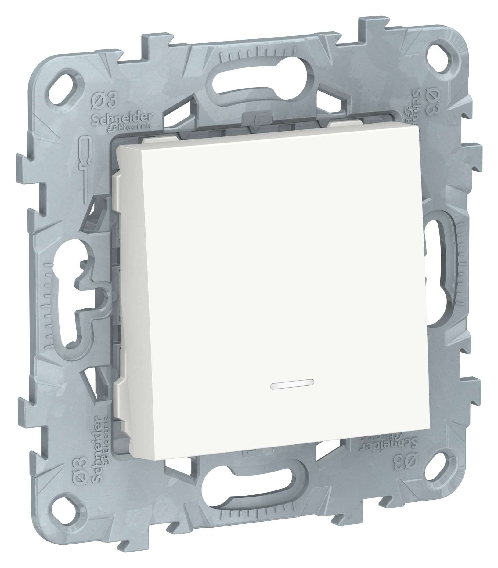 Выключатель одноклавишный Schneider Electric UNICA NEW (белый) с подсветкой предназначен для сетей до 250 В на ток до 10 А. - 1 нормально открытый контакт. - Подсветка делает выключатель легко находимым в отсутствие освещения. - Увеличенные разделители для исключения возможности короткого замыкания.