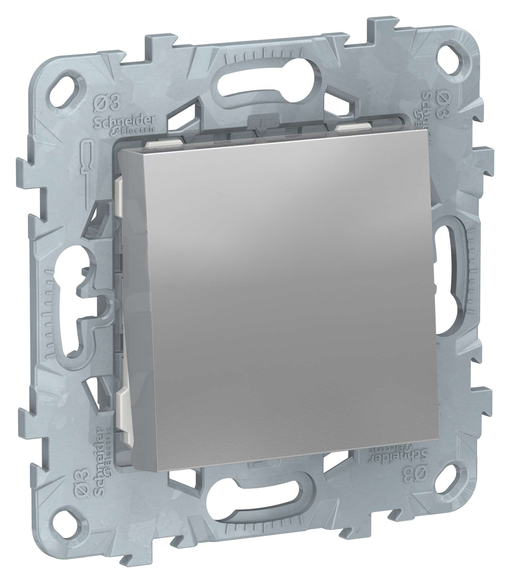 Выключатель одноклавишный Schneider Electric UNICA NEW (алюминий) без подсветки предназначен для сетей до 250 В на ток до 10 А. - 1 нормально открытый контакт. - Специальные направляющие для облегчения ввода кабеля. - Увеличенные разделители для исключения возможности короткого замыкания.