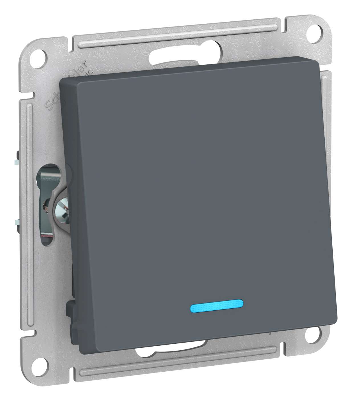 Механизм переключателя 1-клавишного с подсветкой Systeme Electric (ранее Schneider Electric) серии AtlasDesign в цвете грифель подходит для сетей 250 В, на ток 10 А. - Благодаря светодиодной подсветке синего цвета изделие легко найти в темноте. - Переключатель позволяют управлять одним источником света с двух точек. - Лицевые детали из качественного ABS-пластика, устойчивого к царапинам и УФ-излучению. - Усиленные прямые монтажные лапки для лучшей фиксации механизма в монтажной коробке.