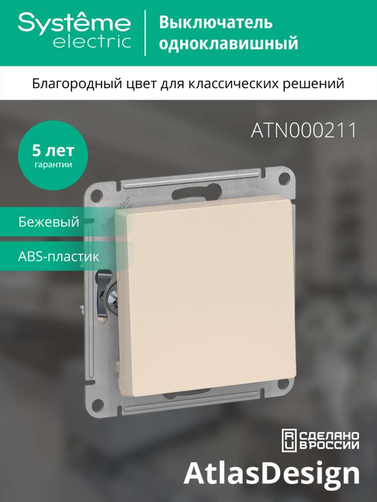 Механизм выключателя 1-клавишного Systeme Electric (ранее Schneider Electric) серии AtlasDesign в бежевом цвете подходит для сетей 250 В, на ток 10 А. - Усиленные прямые монтажные лапки для лучшей фиксации механизма в монтажной коробке. - Лицевые детали из качественного ABS-пластика, устойчивого к царапинам и УФ-излучению.