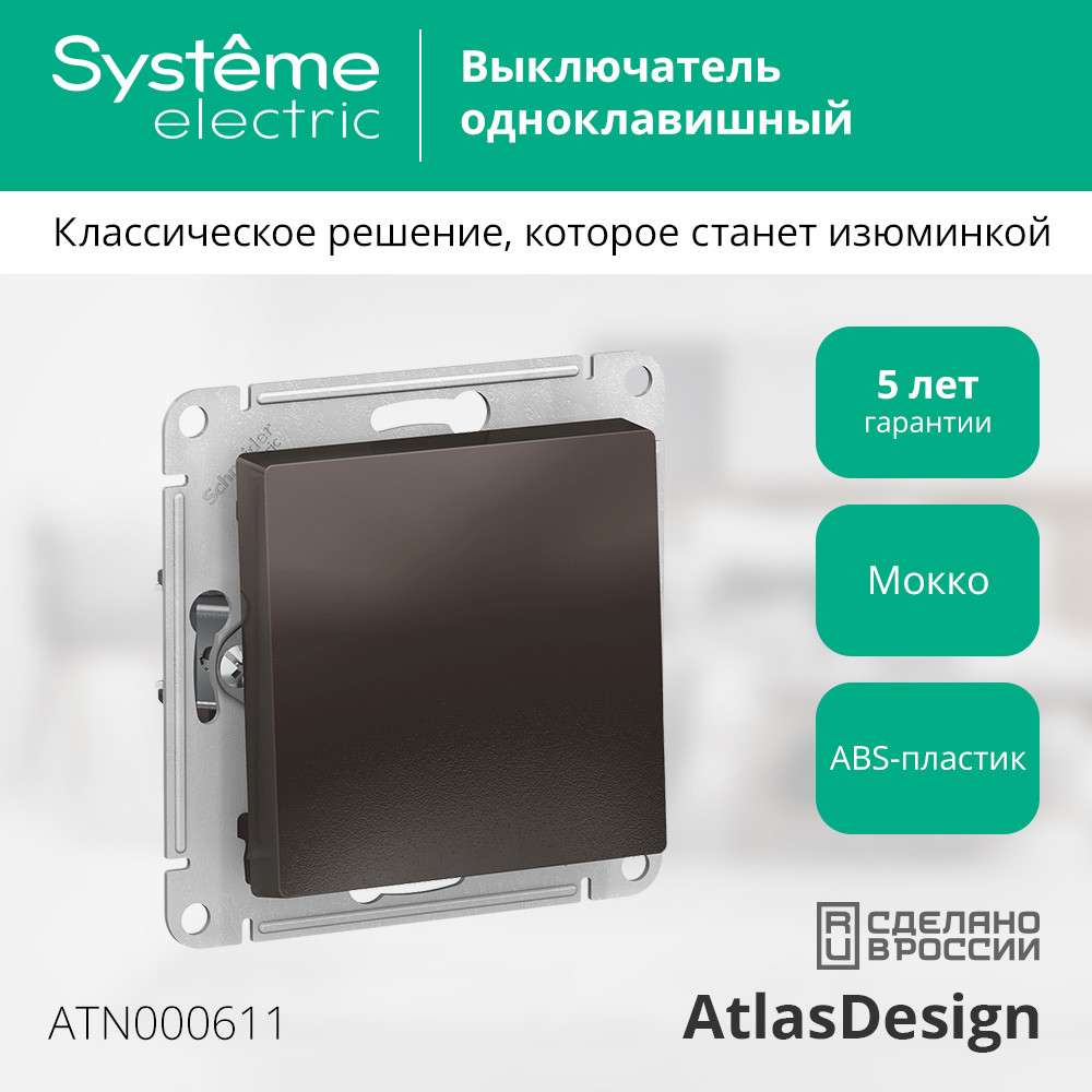 Механизм Systeme Electric (ранее Schneider Electric) серии AtlasDesign в цвете мокко выключателя 1-клавишного подходит для сетей 250 В, на ток 10 А. - Лицевые детали из качественного ABS-пластика, устойчивого к царапинам и УФ-излучению. - Усиленные прямые монтажные лапки для лучшей фиксации механизма в монтажной коробке.