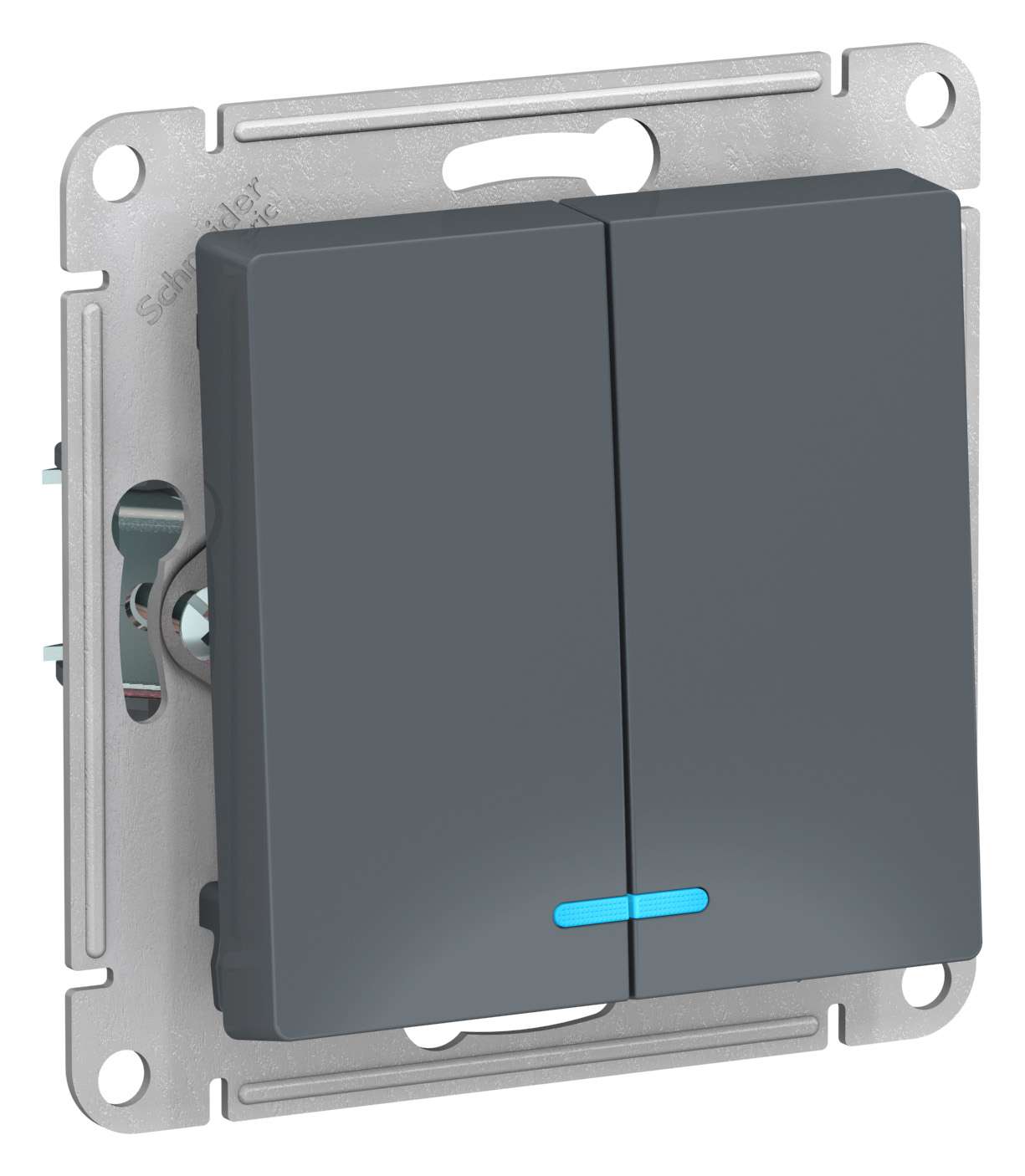Механизм Systeme Electric (ранее Schneider Electric) серии AtlasDesign в цвете грифель выключателя 2-клавишного c подсветкой подходит для сетей 250 В, на ток 10 А. - Благодаря светодиодной подсветке синего цвета изделие легко найти в темноте. - Двухклавишный выключатель позволяет управлять двумя источниками света с одной точки. - Лицевые детали из качественного ABS-пластика, устойчивого к царапинам и УФ-излучению.