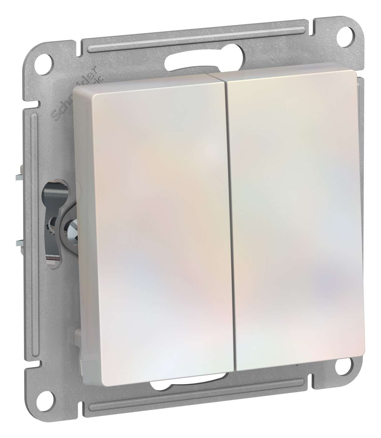 Механизм выключателя 2-клавишного Systeme Electric (ранее Schneider Electric) серии AtlasDesign в цвете жемчуг подходит для сетей 250 В, на ток 10 А. - Двухклавишный выключатель позволяет управлять двумя источниками света с одной точки. - Лицевые детали из качественного ABS-пластика, устойчивого к царапинам и УФ-излучению. - Усиленные прямые монтажные лапки для лучшей фиксации механизма в монтажной коробке.