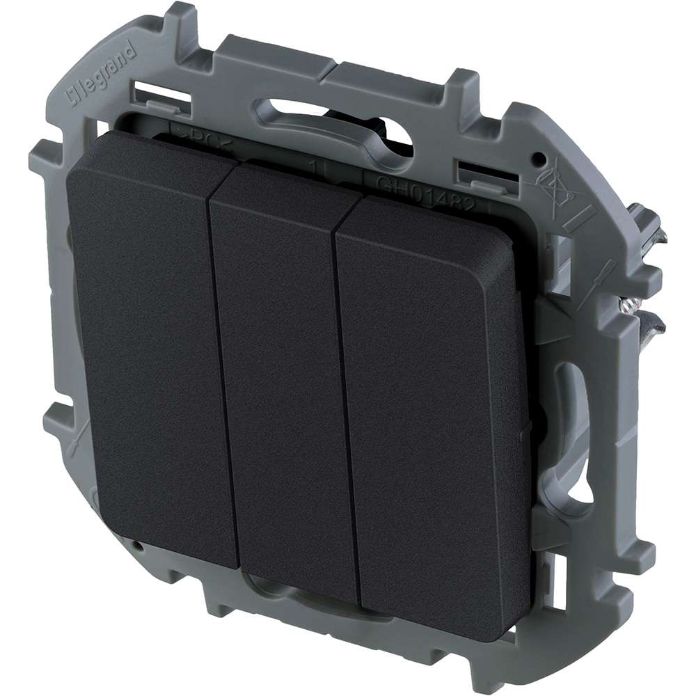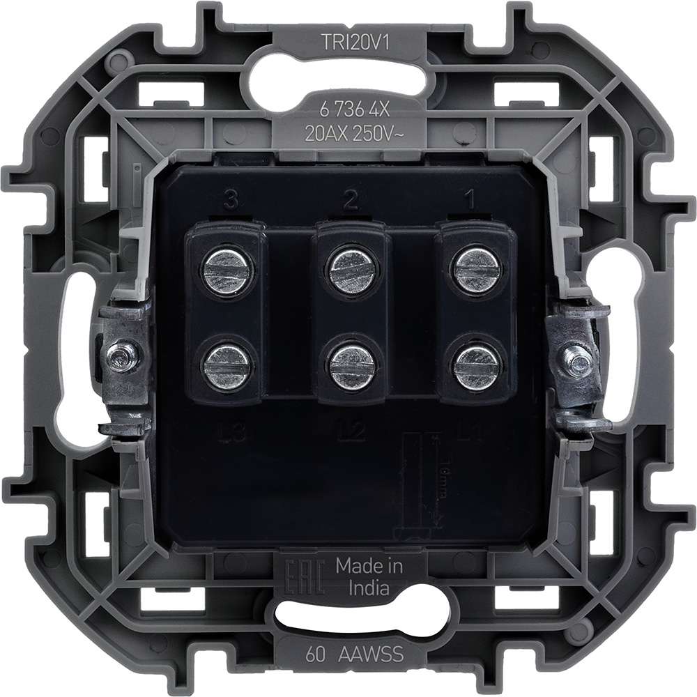 Выключатель трехклавишный Legrand Inspiria для скрытого монтажа, цвет Антрацит, увеличенный номинальный ток 20 А, напряжение 250В. Предназначен для установки в электрических сетях жилых и общественных зданий и используется для управления приборами освещения, вентиляции и т.д. Используется для независимой коммутации трех нагрузок с одного места, подходит для управления многорожковыми люстрами и осветительными приборами с большим количеством ламп. Особенности изделия: - Материал клавиш - глянцевый пластик АБС, стоек к выгоранию и загрязнениям. - Для подсоединения проводов используются винтовые зажимы. - Все токоведущие части выключателя имеют защиту от случайного прикосновения. - Улучшенная эргономика снижает вероятность искрения при коммутации светодиодов. - Ход клавиши короткий, не громкий.