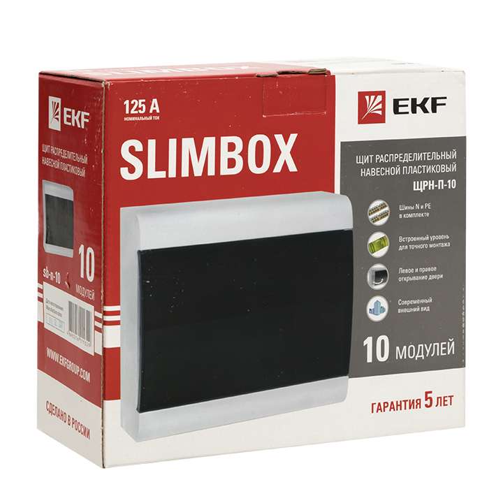 Щиты распределительные пластиковые SlimBox EKF PROxima предназначены для установки модульной аппаратуры: автоматических выключателей, УЗО, таймеров, счетчиков электрической энергии и т. д. Используются для электромонтажа в жилых, административных, торговых помещениях. Электрощиты изготовлены из прочного ABS-пластика глянцевого белого цвета. Имеют полноразмерную затемненную дверцу, что позволяет им эстетично вписаться в интерьер жилых и офисно-торговых помещений. Основание корпуса у навесных щитов имеет малую высоту, что делает сборку щита и подключение проводов более удобным за счет большего свободного пространства для сборщика.