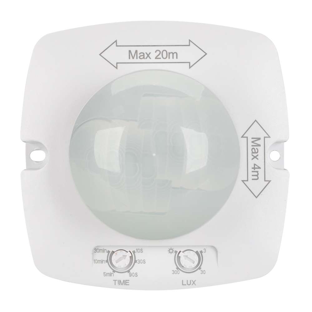 Настенный/потолочный накладной датчик движения (двухпроводная линия), совмещенный с датчиком освещенности. Угол обнаружения 360° в горизонтальной плоскости. Высота установки 4-10 м. Настройки: время отключения (10 c – 30 мин), зона срабатывания (до 20 м), освещенность (3 - 2000 люкс). Максимальная нагрузка 2000 Вт (для ламп накал-я и галогенных), 500 Вт (для светодиодных и люминесцентных ламп), размеры (L×W×H) 102x102x58 мм.