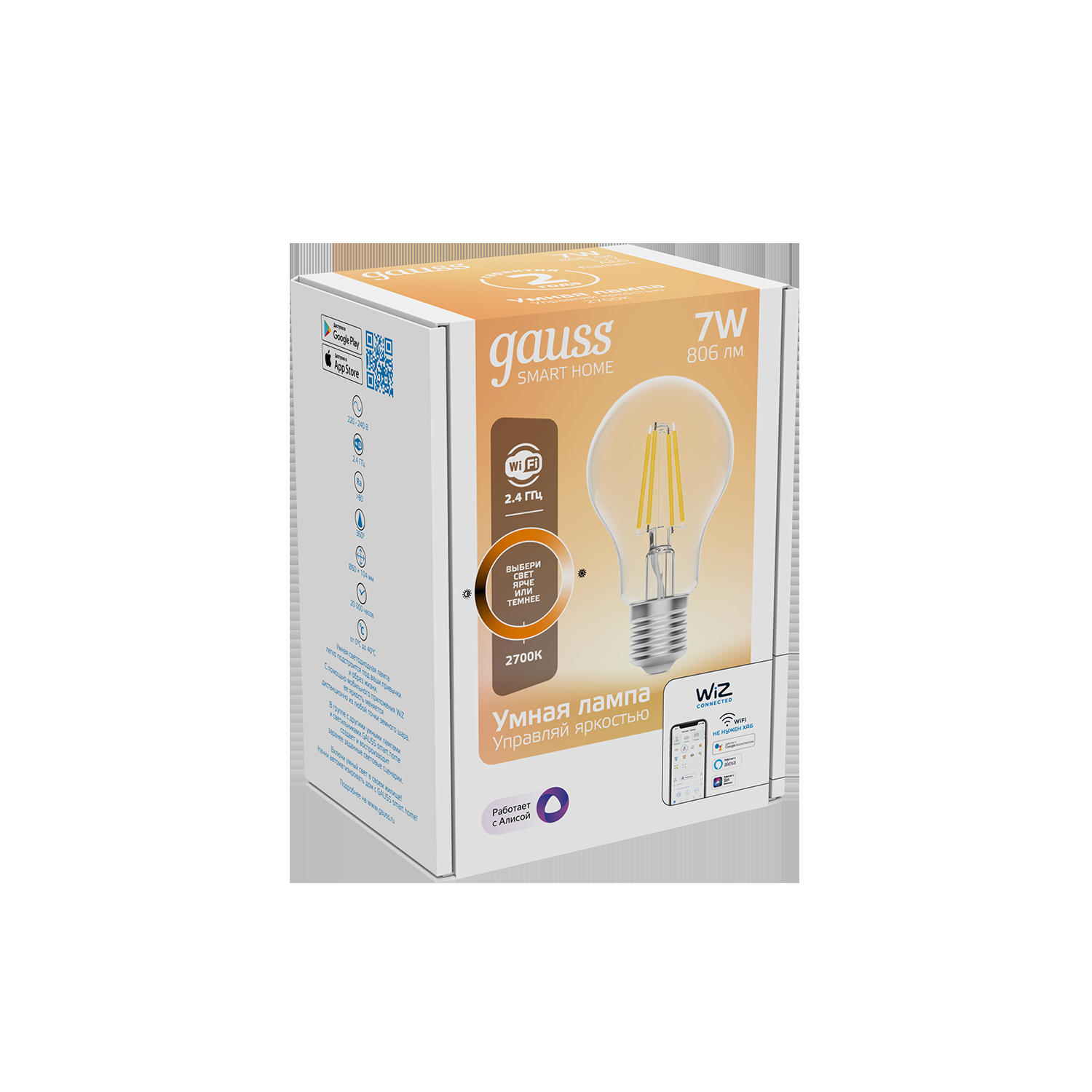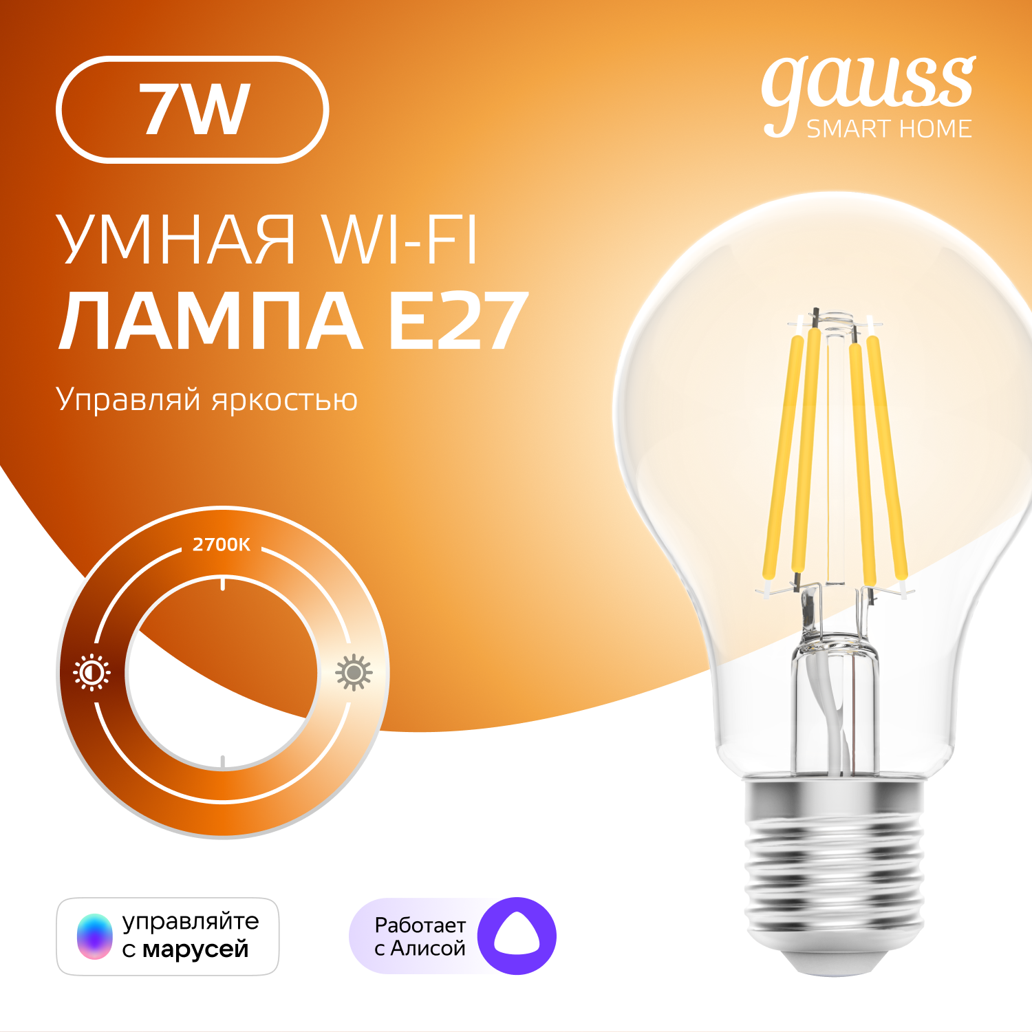 Умная Wi-fi филаментная лампочка Gauss Smart Light DIM E27 A60 7 Вт 2700-6500K, диммируемая, управление голосом/смартфоном Дистанционное управление: управляйте светом через мобильное приложение или голосовой помощник (Алиса, Siri, Google, Маруся) Установка расписаний: автоматизируйте пространство. Свет будет включаться и выключаться по вашему расписанию. Режимы: режимы созданы в Париже специалистами по световым решениям. Температура: свечение может меняться от теплого золотисто-желтого цвета до холодного ослепительно-белого. Сцены: понравился режим в той или иной комнате Зафиксируйте его в сцене и включайте одним кликом на смартфоне Умный дом начинается с лампочки Gauss Smart! Помимо филаментных ламп в ассортименте бренда представлены и другие умные устройства, среди которых: лента, датчик движения, розетка, светодиодные лампы, а также встраиваемые и накладные светильники. Управляйте светом – управляйте вдохновением вместе с Gauss