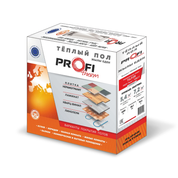 Теплый пол PROFI therm — это нагревательная секция из двухжильного экранированного кабеля для электрического обогрева пола. Так как кабель имеет толщину всего 4,5 мм, он может быть смонтирован непосредственно в слой плиточного клея. Преимущественно кабель используется для монтажа в мембрану, но так же может быть смонтирован в штробу, либо с помощью монтажной ленты. Мощность на 1м2 вы регулируете за счет шага укладки греющего кабеля. Чем меньше шаг укладки, тем больше мощность. Нагревательные секции можно использовать с большинством типов лицевого покрытия пола. Общая мощность нагревательной секции (Вт) и длина греющего кабеля (м) определяются в зависимости от размера и типа помещения, типа установка и вида напольного покрытия.