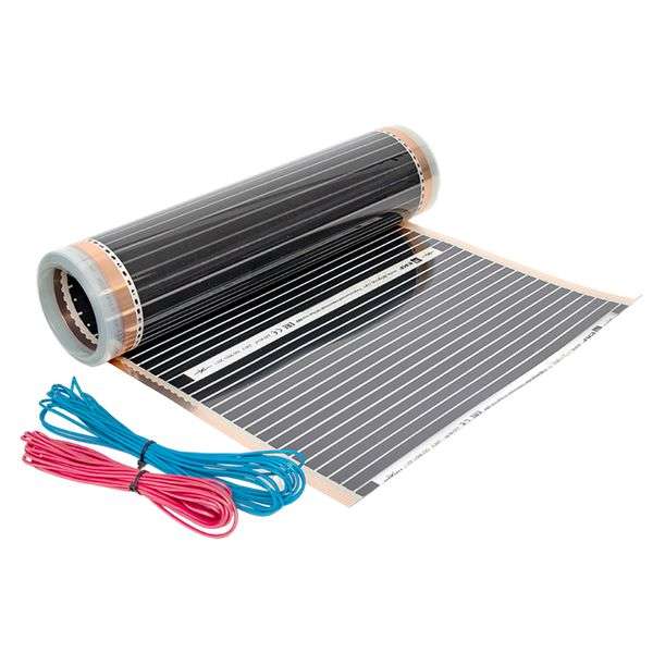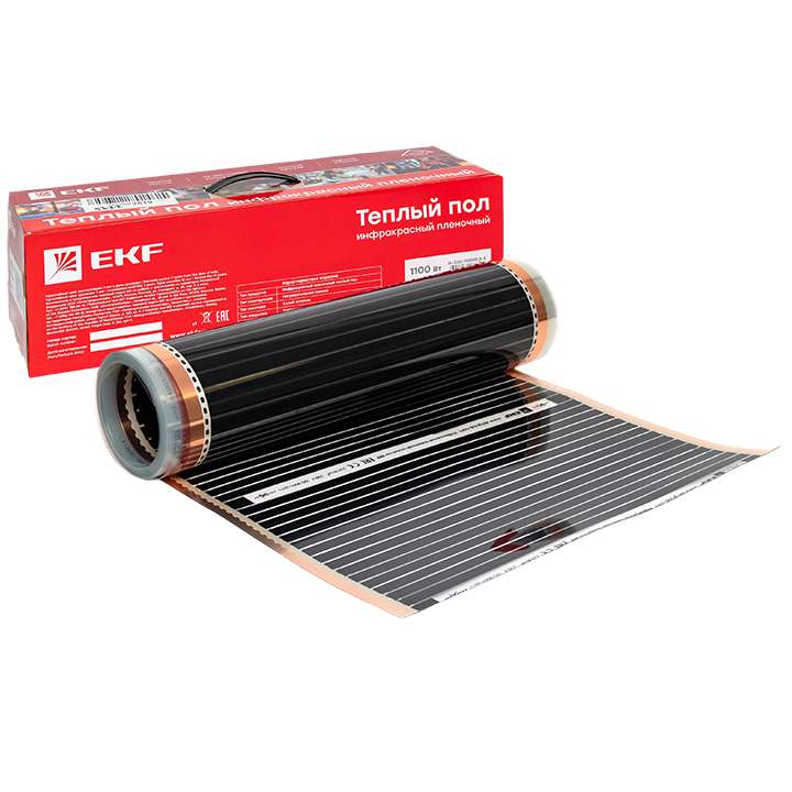 Пленочный теплый пол EKF применяется для сухого монтажа без стяжки не только при капитальном ремонте, но и при косметическом. Толщина пленки -0,338 мм. Обеспечивает быстрый и легкий монтаж. Идеально подходит для укладки под ламинат, паркетную доску, мягкое напольное покрытие: линолеум, ковролин. Инфракрасный пленочный теплый пол состоит из следующих элементов. Полосы углеродного материала шириной около 1,5 см соединены между собой при помощи медных шин с серебряным покрытием, которые и проводят электрический ток. Нагревательный элемент заламинирован с двух сторон плотным полимером, который не задерживает инфракрасное излучение и обеспечивает отличную защиту от попадания влаги, пробоев и возгорания.