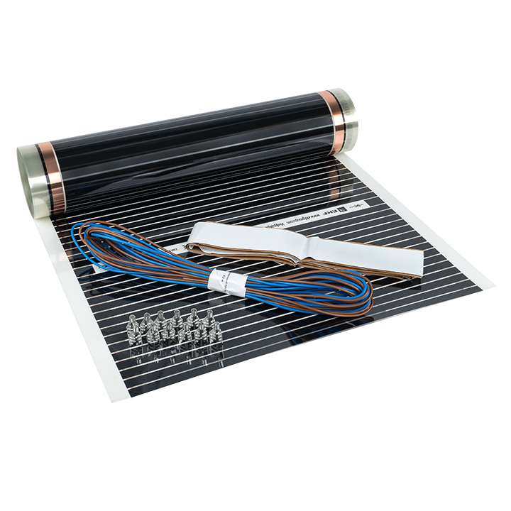 Пленочный теплый пол EKF применяется для сухого монтажа без стяжки не только при капитальном ремонте, но и при косметическом. Толщина пленки -0,338 мм. Обеспечивает быстрый и легкий монтаж. Идеально подходит для укладки под ламинат, паркетную доску, мягкое напольное покрытие: линолеум, ковролин. Инфракрасный пленочный теплый пол состоит из следующих элементов. Полосы углеродного материала шириной около 1,5 см соединены между собой при помощи медных шин с серебряным покрытием, которые и проводят электрический ток. Нагревательный элемент заламинирован с двух сторон плотным полимером, который не задерживает инфракрасное излучение и обеспечивает отличную защиту от попадания влаги, пробоев и возгорания.