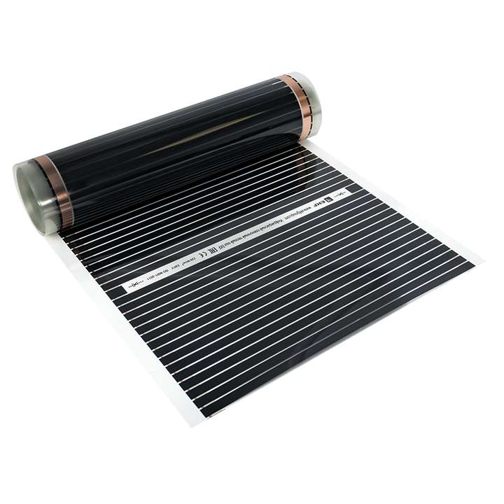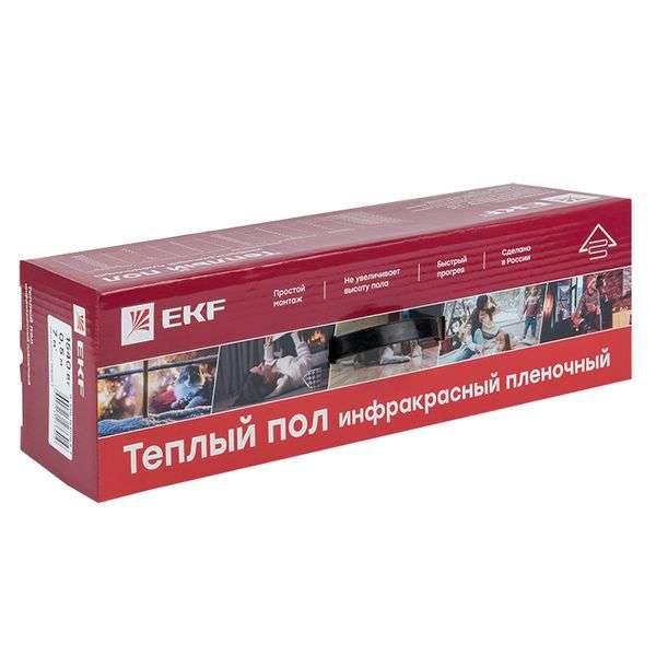 Пленочный теплый пол EKF применяется для сухого монтажа без стяжки не только при капитальном ремонте, но и при косметическом. Толщина пленки -0,338 мм. Обеспечивает быстрый и легкий монтаж. Идеально подходит для укладки под ламинат, паркетную доску, мягкое напольное покрытие: линолеум, ковролин. Инфракрасный пленочный теплый пол состоит из следующих элементов. Полосы углеродного материала шириной около 1,5 см соединены между собой при помощи медных шин с серебряным покрытием, которые и проводят электрический ток. Нагревательный элемент заламинирован с двух сторон плотным полимером, который не задерживает инфракрасное излучение и обеспечивает отличную защиту от попадания влаги, пробоев и возгорания.