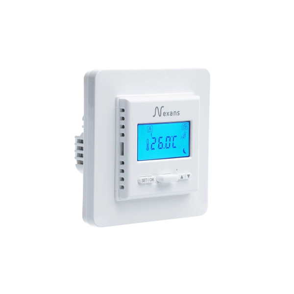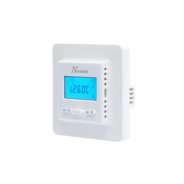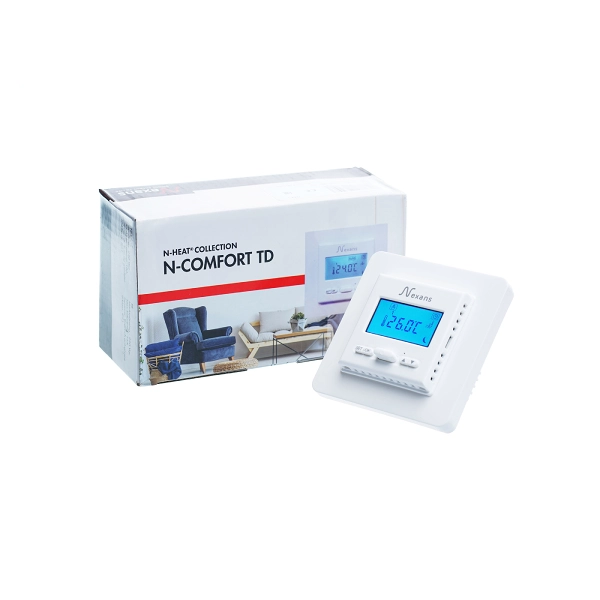 Электронный терморегулятор Nexans N-COMFORT TD - это удобный для пользователя 7-дневный программируемый терморегулятор для регулирования температуры в помещениях с электрическим подогревом. В данном терморегулятора есть два датчика: датчик температуры пола и встроенный датчик температуры воздуха. Датчик температуры пола также может быть использован для ограничения температуры в полу, пока комнатная температура контролируется встроенным датчиком (режим двойного датчика). Терморегулятор поставляется с рамками Elko Plus Polar White and Schneider Exact White.