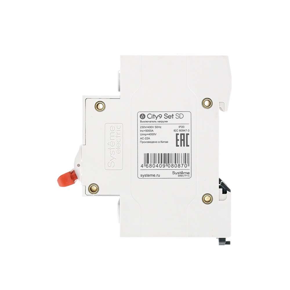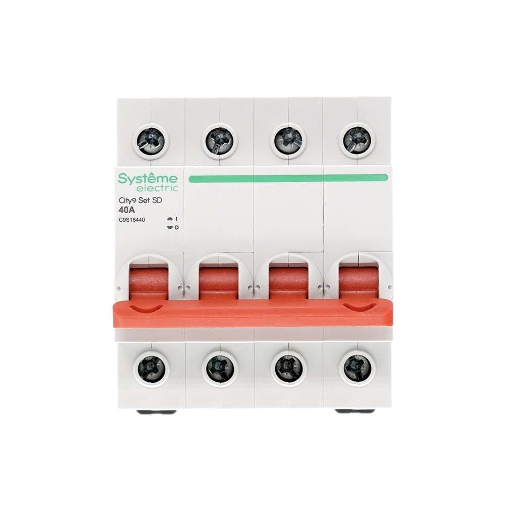 Выключатель-разъединитель серии City9 Set Systeme Electric, 4-полюсный, номинальный ток 40 А, с красной рукояткой управления. Предназначен для включения и отключения нагрузок в электрических сетях напряжением 400 В. Категория применения AC-22A. Двойной разрыв цепи обеспечивает гарантированное отключение питания и отсутствие сваривания контактов. Крепление на DIN-рейку шириной 35 мм.